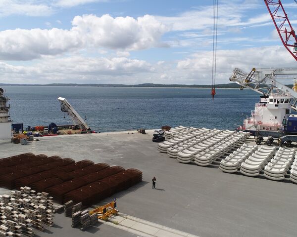 Mukran Industrial Site bietet nicht nur beste Voraussetzungen für Ihre Produktion, sondern auch für Ihre Logistik. Unser Transport-, Verlade- und Umschlagsequipment lässt keine Wünsche offen und ist selbst für besonders schwere und sperrige Lasten, beispielsweise Rohre für Pipelines, ausgelegt. Schiffe können an der Kaikante einfach an- und ablegen und Zement, sonstige Zuschlagstoffe, Betonfertigteile oder Stahlbauelemente auch in größeren Dimensionen aufnehmen oder abladen. Ist die Ware an Bord, kann es gleich ohne umständliche Revierfahrt losgehen. Wir sind Deutschlands nordöstlichster Tiefwasserhafen. Die Wassertiefe beträgt derzeit 10,5 Meter. Kurz bis mittelfristig planen wir einen Ausbau auf sogar 14 Meter. Attraktive Märkte in Skandinavien und im Baltikum erreichen Sie per Schiff in einem, maximal zwei Tagen.