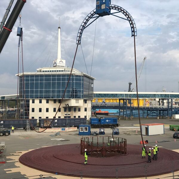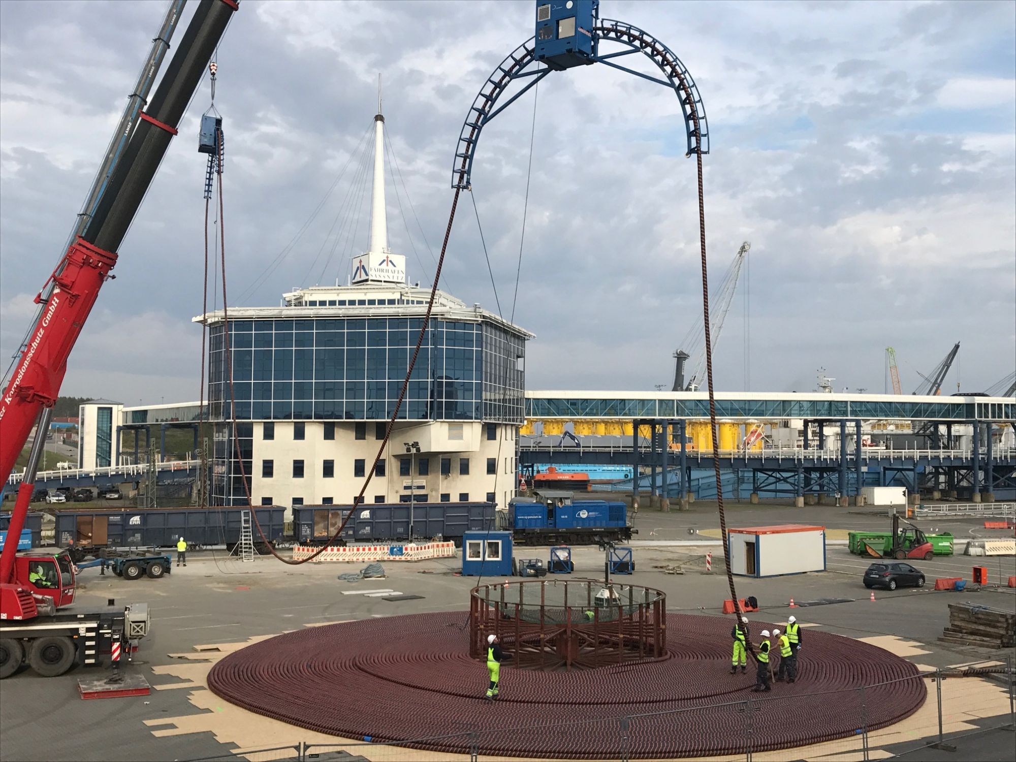 Bild 1_Entladung Kabel (Quelle: Mukran Port): Im Mukran Port werden die Kabel auf Coils aufgerollt und zwischengelagert.