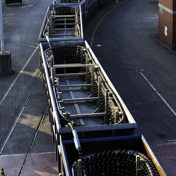 Sassnitz-Mukran, 28. September 2017 — Insgesamt 76 Kilometer Kabel für ein aktuelles Offshore-Windparkprojekt in der Ostsee sind auf dem Weg in den Mukran Port auf der Insel Rügen. Der erste von fünf Zügen mit Seekabeln von Nexans aus dem Werk Hannover hat heute den Hafen erreicht. Über das neue Gleis 66 werden die Kabel bis zur Kaikante gebracht und dort gelagert, bevor sie vom Verlegeschiff aufgenommen werden. Der Mukran Port ist ein wichtiger Umschlagplatz für die Offshore-Windindustrie und Projekte in der Ostsee.