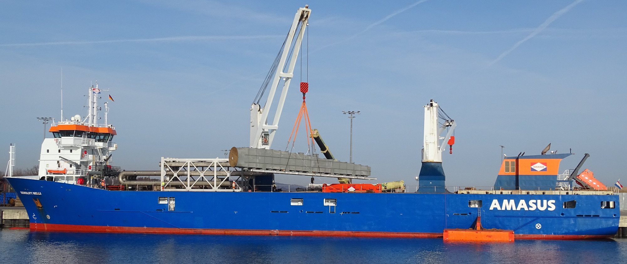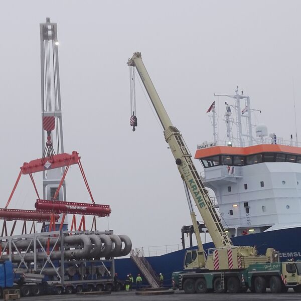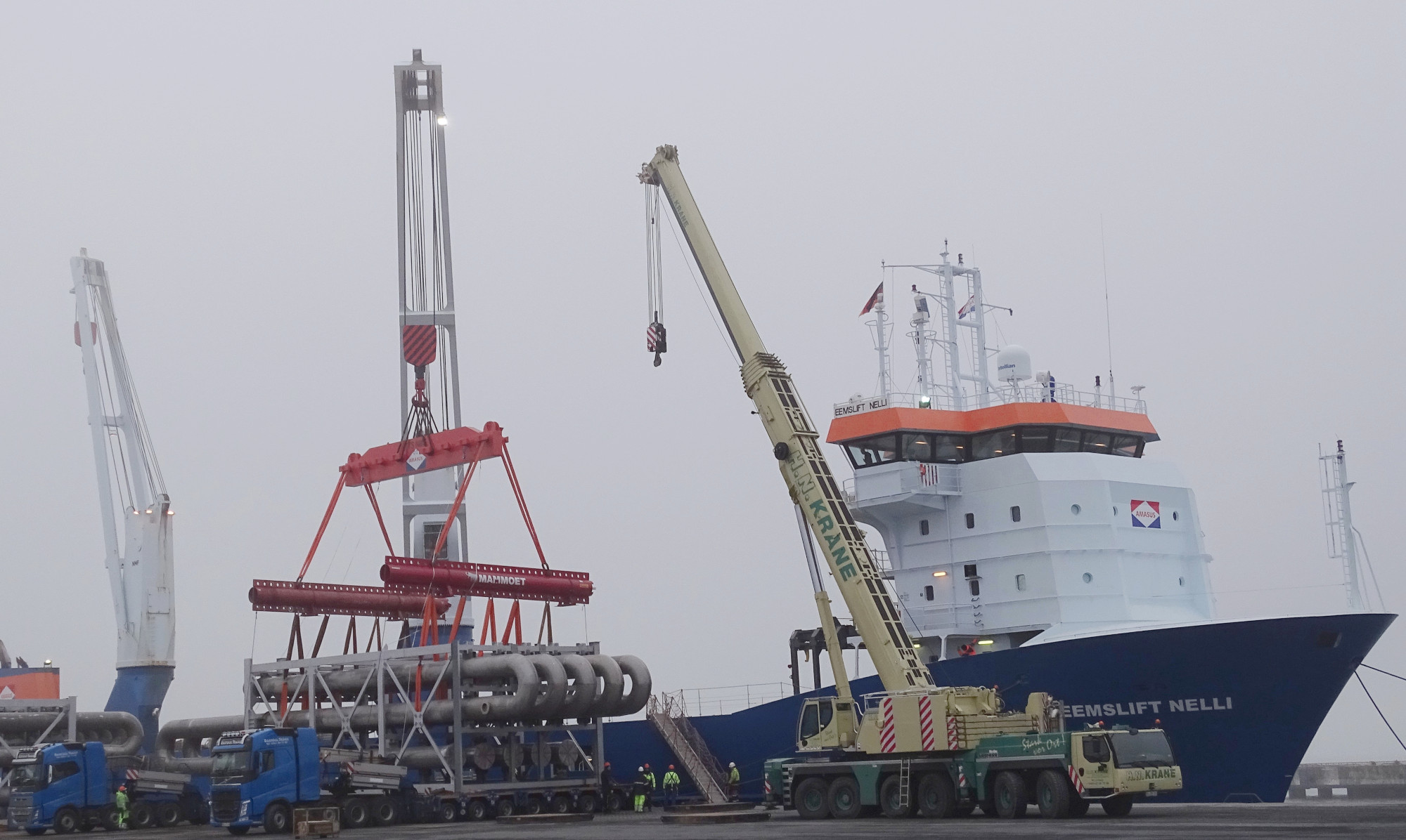 Sassnitz-Mukran, 20. Februar 2019 — Im Mukran Port wurden am Samstag (16.02.2019) die Verladearbeiten der Bestandteile eines Rohrschlangen-Kühlers abgeschlossen. Die Ladung besteht aus sechs modularen Prozessrahmen (Skids), Einbauteilen und Baustellenausrüstung. Insgesamt sind 600 Tonnen an Material verladen und anschließend nach Norwegen verschifft worden.
