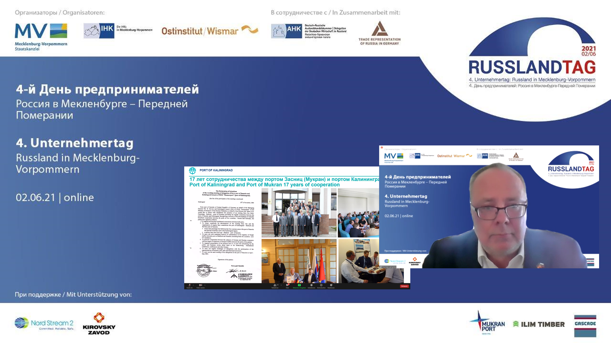 Sassnitz-Mukran, 03.06.2021 — Thomas Langlotz, Prokurist und Marketingleiter des Mukran Port, hat gestern im Rahmen des „4. Unternehmertages: Russland in Mecklenburg-Vorpommern“ an dem Workshop „Transport & Logistik“ teilgenommen. Er referierte zu den Themen „Intermodale Transportketten“ (Neue Seidenstraße „Baltic Sea Bridge“) und „Projektladungen“ (Russisch-Deutsche Logistikketten und Umschlagkapazitäten).