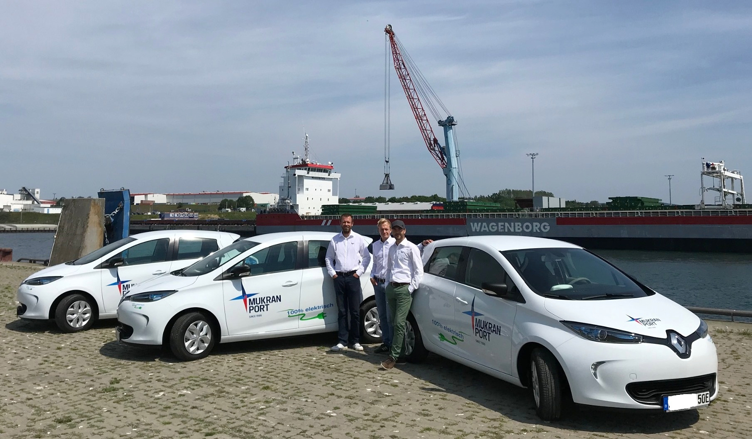 Sassnitz-Mukran, 11. Juli 2019 — Der Mukran Port setzt verstärkt auf grüne Mobilität. Aktueller Beitrag zum Klimaschutz des Hafens ist die Umstellung der betriebseigenen Pkw-Flotte auf Elektrofahrzeuge. Zunächst werden drei E-Autos vom Typ Renault Zoe für Verkehre am Standort selbst sowie für Strecken bis nach Stralsund eingesetzt. Auch die notwendige Ladeinfrastruktur wurde bereits im Hafengebiet installiert.
