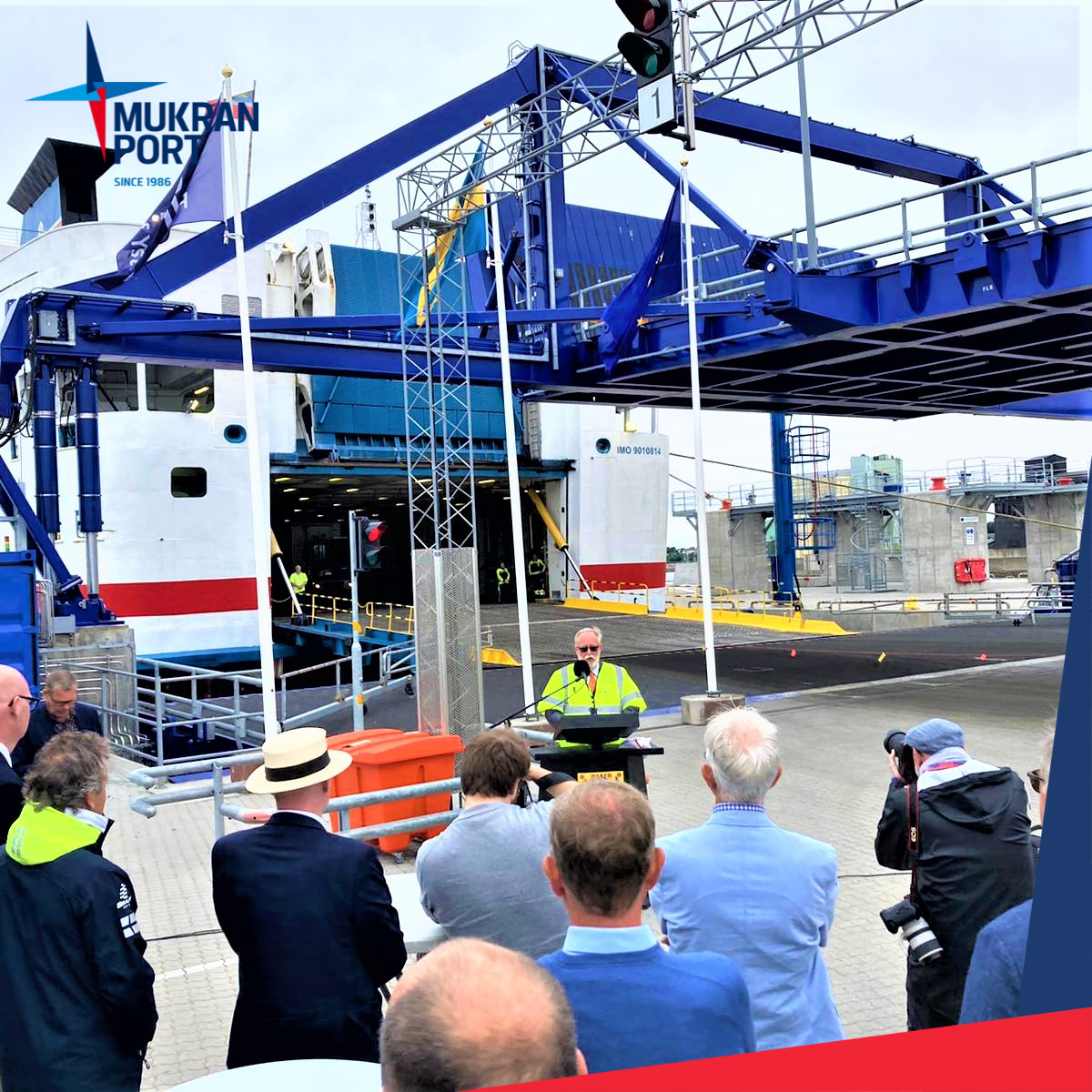 Sassnitz - Mukran, 29. August 2022 — Mukran Port besucht den Hafen Ystad zur offiziellen Einweihung des neuen Fähranlegers mit den Liegeplätzen 7 und 8. Nach der Begrüßung durch die Bürgermeisterin Paula Nilsson und den Geschäftsführer des Hafens Ystad Björn Boström, wurde die Plakette des Mukran Port überreicht. Die Kapazität des Hafens wurde mit den beiden neuen Liegeplätzen erweitert und ist für Schiffe bis 250 Meter geeignet. Die neu dazu gewonnene Terminalfläche beträgt circa 140.000 Quadratmeter.