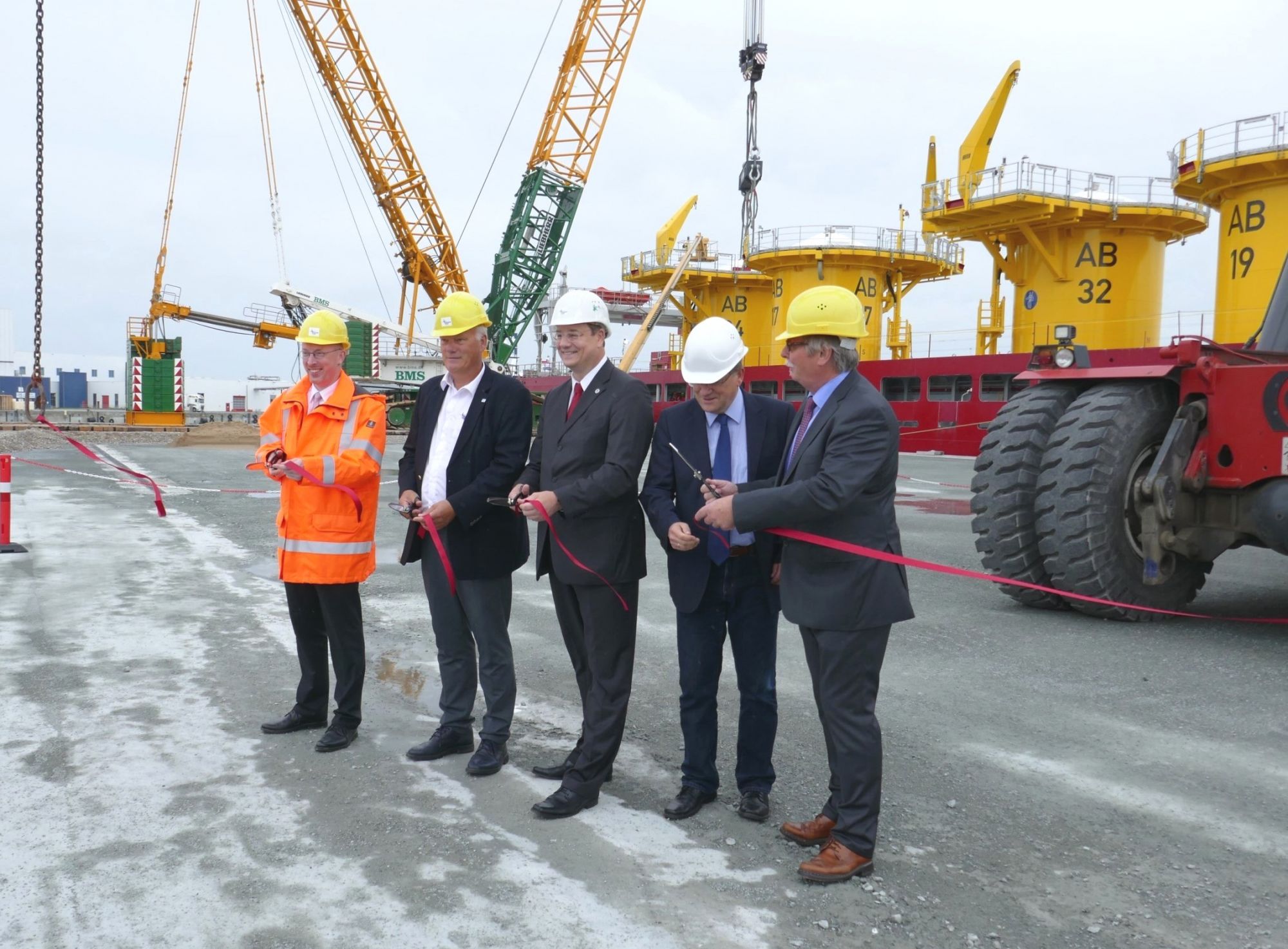 Sassnitz-Mukran, 26. Juli 2017 — Im Mukran Port fand im Beisein von Energieminister Christian Pegel die offizielle Freigabe des neuen Liegeplatzes 10 statt. Durch diesen Ausbau der Hafeninfrastruktur, der ausschließlich von regionalen Unternehmen aus Mecklenburg-Vorpommern durchgeführt wurde, sind die Bewältigung des zunehmenden Projektgeschäfts sowie die zeitgleiche Realisierung mehrerer Offshore-Wind-Projekte vom Mukran Port aus möglich. Die geschaffene Kaifläche ist mit einer Schwerlastplatte versehen, die beim Handling schwerer Komponenten – beispielsweise bei Windkraftprojekten – benötigt wird.