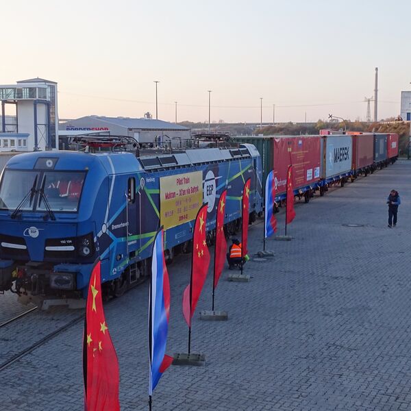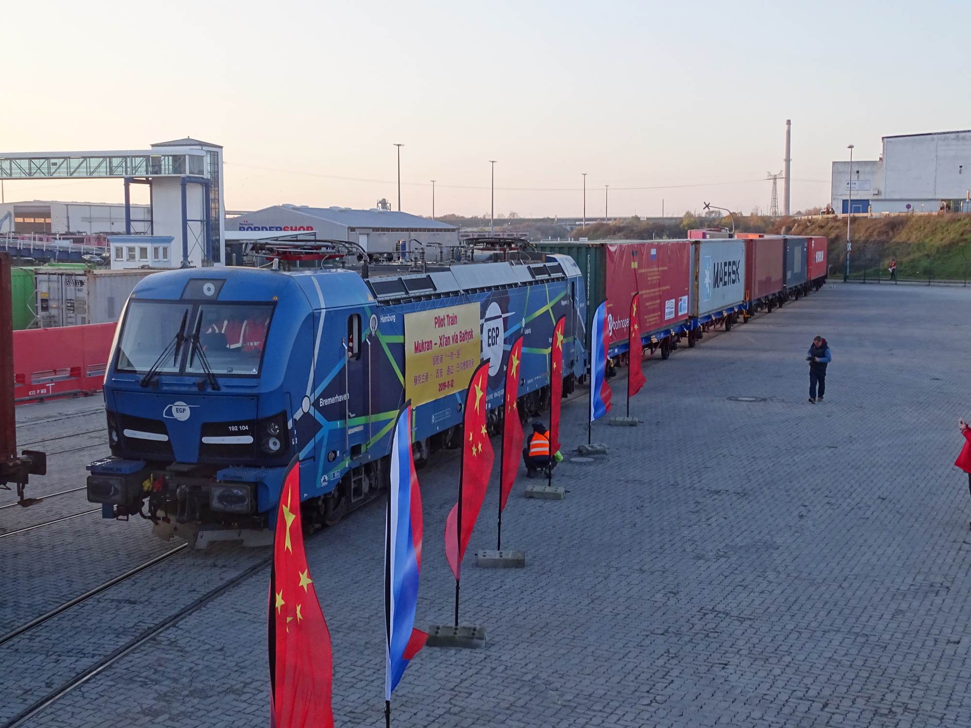 Sassnitz-Mukran, 12. November 2019 — Die ersten zwei direkten Güterzüge zwischen China und Mecklenburg-Vorpommern trafen sich am Dienstag, den 12.11.2019 im Mukran Port. Der ostgehende Zug ging mit 48 Container auf die Reise. Der westgehende 640m lange Güterzug startete seine 10.000 Kilometer lange Reise mit 42 Containern in Xi´an China über Kasachstan, Russland und Weißrussland nach Baltijsk in Kaliningrad, wo die Container auf einen Short Sea Carrier umgeladen wurden. Im Hafen des Mukran Port wurden die Container vom Schiff erneut auf Schienen verladen vom Team der Mukran Port Terminals GmbH & Co. KG. Im Mukran Port wurde dann mit allen Beteiligten der neue Korridor der chinesischen Seidenstraßeninitiative feierlich eröffnet.