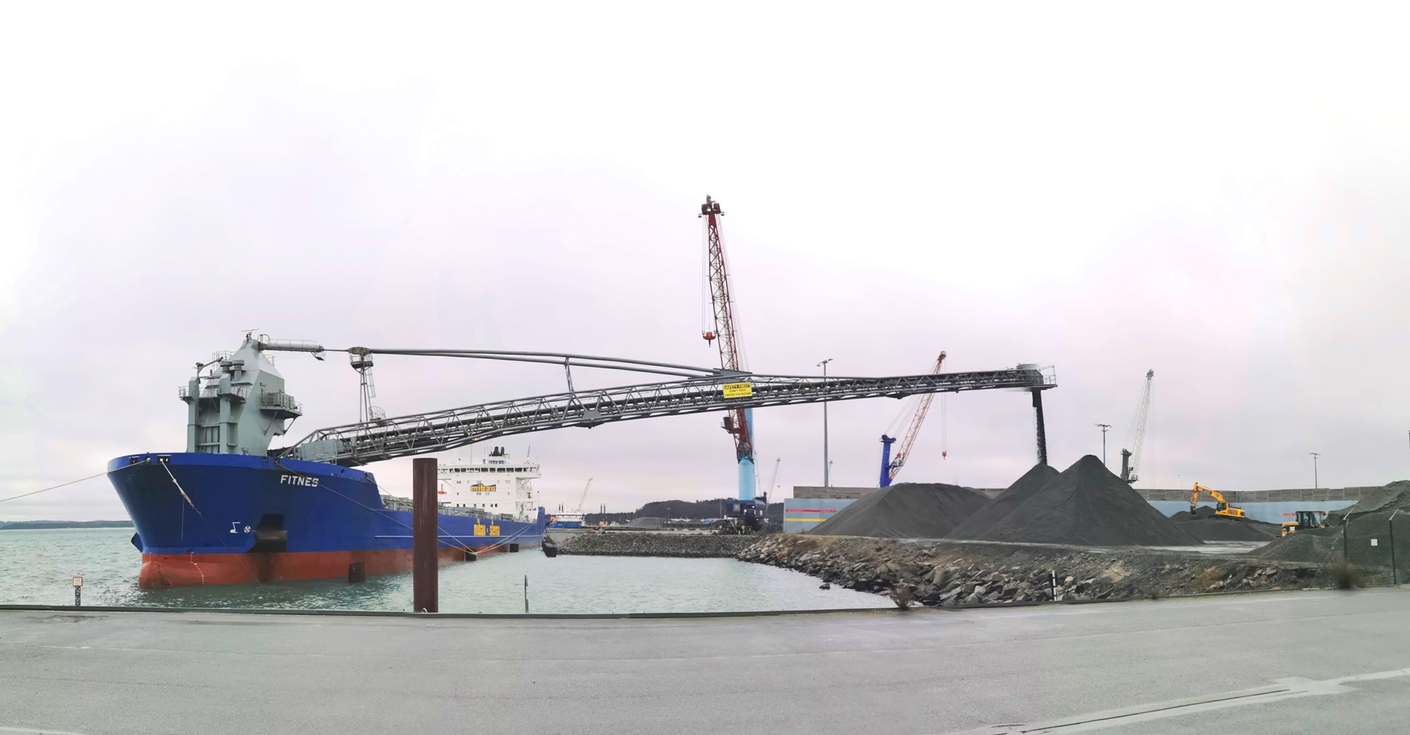 Sassnitz-Mukran, 08.02.2022 - Der Bulk Carrier FITNES mit einer Ladekapazität von 33.100 Tonnen (DWT) hat für die Mibau am Liegeplatz 10a circa 30.000 Tonnen Schotter aus Norwegen gelöscht. Das Schiff mit einer Länge von 176 m kann mit dem 86 Meter langen Ausleger ohne fremdes Umschlagsgerät das Schüttgut über Förderbänder entladen. Die Löschleistung liegt bei 3.000 Tonnen pro Stunde.