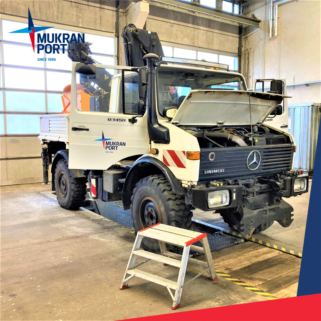 Sassnitz-Mukran, 14. November 2022 - Mukran Port is prepared for winter. In the MPT workshop this week, the Unimog is being prepared for its winter deployment and technically upgraded to ensure traffic safety in the port with a snow plough and salt spreader.
